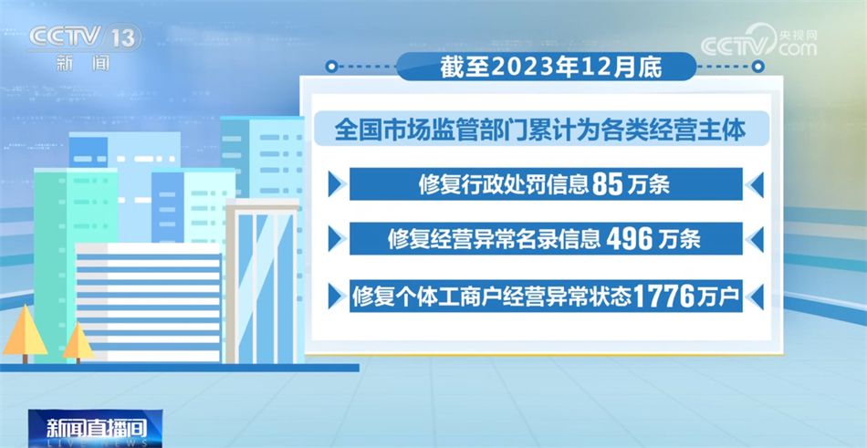 截至2023年12月底,全國(guó)市場(chǎng)監(jiān)管部門(mén)累計(jì)為各類(lèi)經(jīng)營(yíng)主體修復(fù)行政處罰信息85萬(wàn)條,修復(fù)經(jīng)營(yíng)異常名錄信息496萬(wàn)條,修復(fù)個(gè)體工商戶(hù)經(jīng)營(yíng)異常狀態(tài)1776萬(wàn)戶(hù)。
