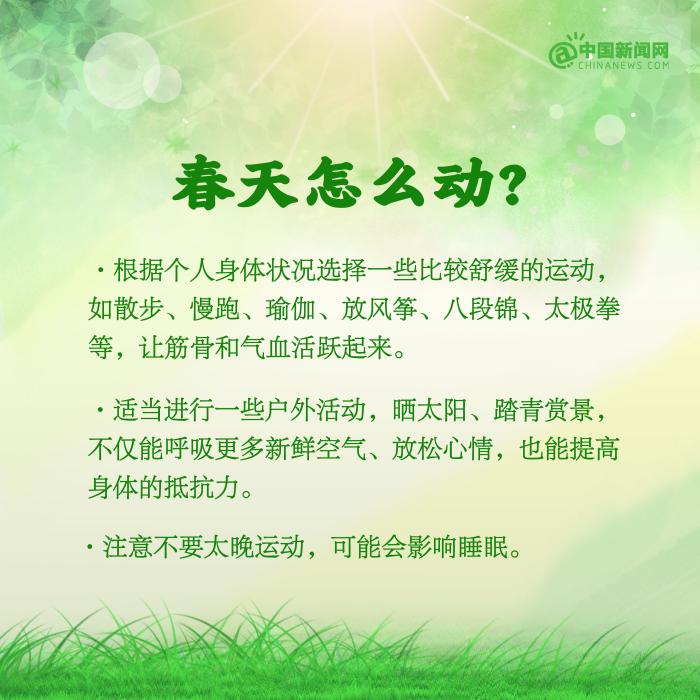 春天是萬物復(fù)蘇的季節(jié),也是調(diào)養(yǎng)身體的好時節(jié)。①每天保證6~8小時的睡眠,避免熬夜;②適當(dāng)進行一些戶外活動,曬太陽、踏青賞景等;③不過早減衣,穿衣注意下厚上薄;④注意清淡飲食,多吃蔬菜,多喝水……春季養(yǎng)生要注意什么?詳戳↓↓
