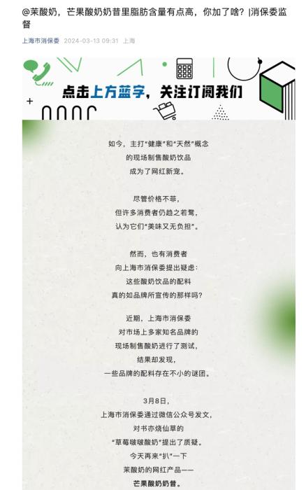 上海市消保委點名茉酸奶 質(zhì)疑芒果酸奶奶昔成分
