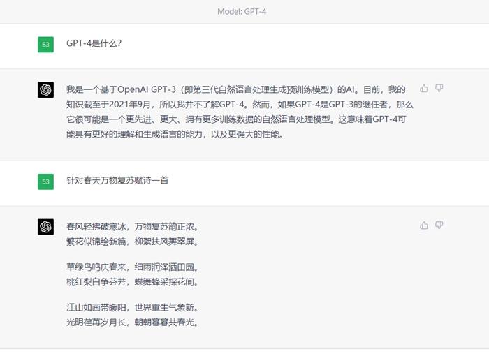 目前GPT-4僅限于ChatGPT Plus訂戶使用。記者體驗(yàn)時(shí)發(fā)現(xiàn),GPT-4生成速度比較慢,但回答簡明扼要,更有創(chuàng)造性,無論是寫詩歌還是故事劇本都不在話下。例如它可以根據(jù)“春天萬物復(fù)蘇”賦詩一首或者寫成一個(gè)愛情故事的劇本。