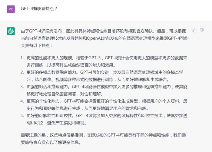 ChatGPT回答GPT-4有哪些特點(diǎn)。截圖