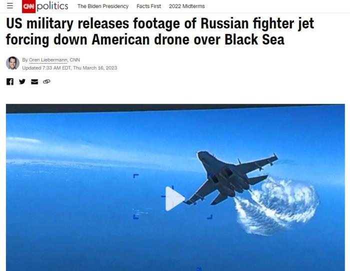 報(bào)道還稱,當(dāng)俄羅斯蘇-27戰(zhàn)斗機(jī)再次靠近時(shí),又一次“傾倒燃料”。隨后,俄羅斯蘇-27戰(zhàn)斗機(jī)與美國(guó)MQ-9“死神”無(wú)人機(jī)“相撞”,導(dǎo)致螺旋槳受損,無(wú)人機(jī)的視頻也由此中斷。不過(guò),CNN同時(shí)指出,俄羅斯否認(rèn)發(fā)生了“碰撞”。