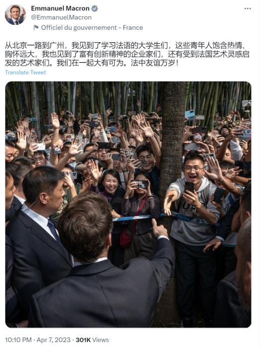 馬克龍寫道,“從北京一路到廣州,我見到了學(xué)習(xí)法語的大學(xué)生們,這些青年人飽含熱情、胸懷遠(yuǎn)大,我也見到了富有創(chuàng)新精神的企業(yè)家們,還有受到法國(guó)藝術(shù)靈感啟發(fā)的藝術(shù)家們。我們?cè)谝黄鸫笥锌蔀椤7ㄖ杏颜x萬歲!”