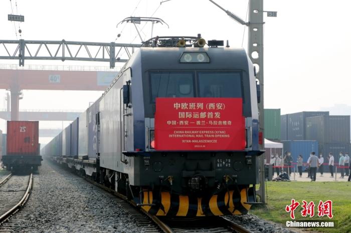 資料圖:2022年9月16日,中歐班列(西安)國(guó)際運(yùn)郵專線首次開(kāi)行,列車裝載著國(guó)際郵件、包裹、商業(yè)快件從西安國(guó)際港站駛出,經(jīng)阿拉山口口岸出境,將于約12天后抵達(dá)波蘭馬拉舍維奇,郵件再交由波蘭郵政轉(zhuǎn)運(yùn)到歐洲各國(guó)。 中新社記者 張遠(yuǎn) 攝