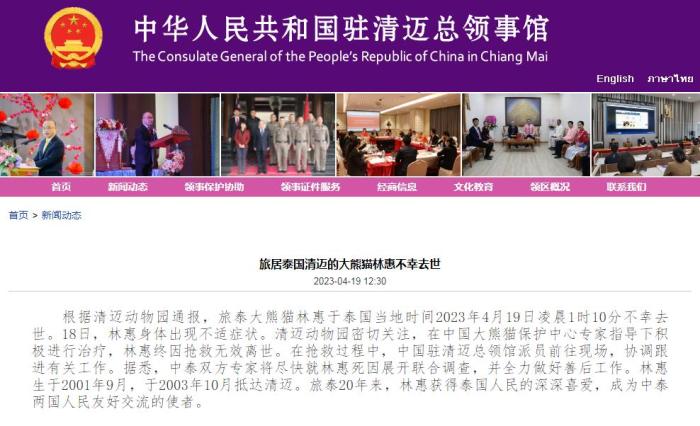 中新網(wǎng)4月19日電 據(jù)中國駐清邁總領(lǐng)事館消息,根據(jù)清邁動物園通報,旅泰大熊貓林惠于泰國當?shù)貢r間2023年4月19日凌晨1時10分不幸去世。