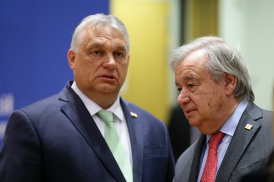 3月23日,在比利時(shí)布魯塞爾的歐盟總部,聯(lián)合國(guó)秘書長(zhǎng)古特雷斯(右)與匈牙利總理歐爾班在歐盟峰會(huì)開(kāi)始前交談。(新華社記者鄭煥松攝)