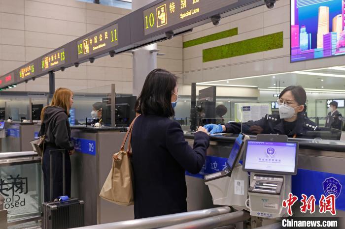 資料圖:虹橋邊檢站民警在對(duì)出境旅客進(jìn)行信息核查。 殷立勤 攝
