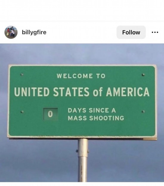 網(wǎng)友Billygfire創(chuàng)作了一塊高速公路廣告牌,上面寫(xiě)道:“歡迎來(lái)到美國(guó),距離上一次大規(guī)模槍擊已經(jīng)過(guò)了0天?!?/p>