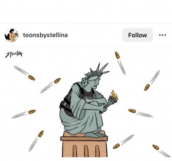 這幅漫畫(huà)顯示,面對(duì)來(lái)自四面八方的子彈,身穿防彈衣的自由女神抱著膝蓋瑟瑟發(fā)抖。