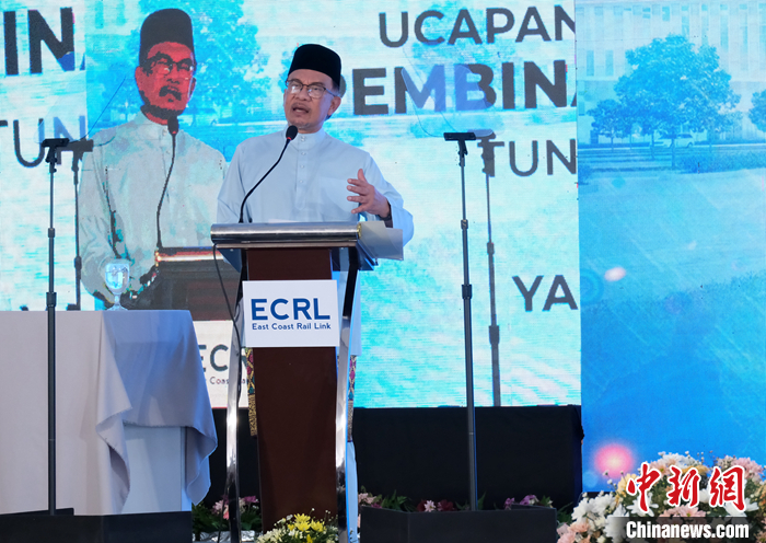 5月12日,馬來西亞東海岸鐵路首個(gè)車站開工儀式在吉蘭丹州哥打巴魯舉行。馬來西亞總理安瓦爾出席儀式并致辭。 中新社記者 陳悅 攝