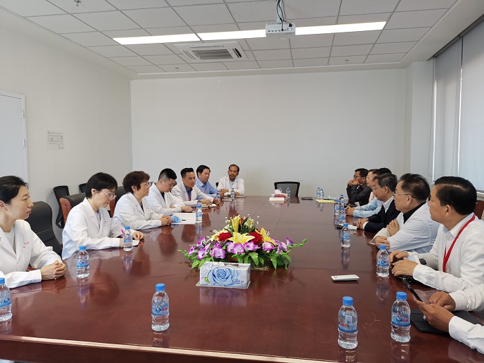 中國援柬中醫(yī)抗疫醫(yī)療隊管理組和考斯瑪中柬友誼醫(yī)院院方座談。中國援柬中醫(yī)抗疫醫(yī)療隊供圖