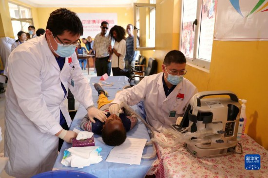5月29日,在埃塞俄比亞首都亞的斯亞貝巴,第24批中國援埃塞醫(yī)療隊隊員為當(dāng)?shù)馗@旱膬和M行體檢。新華社記者 汪平 攝