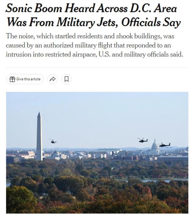 當(dāng)?shù)貢r間4日,一架塞斯納輕型飛機(jī)疑似闖入華盛頓上空,美軍F-16噴氣式戰(zhàn)斗機(jī)緊急起飛高速追擊,并在美國首都上空引發(fā)音爆。期間,美軍試圖與塞斯納飛機(jī)上的飛行員建立聯(lián)系。