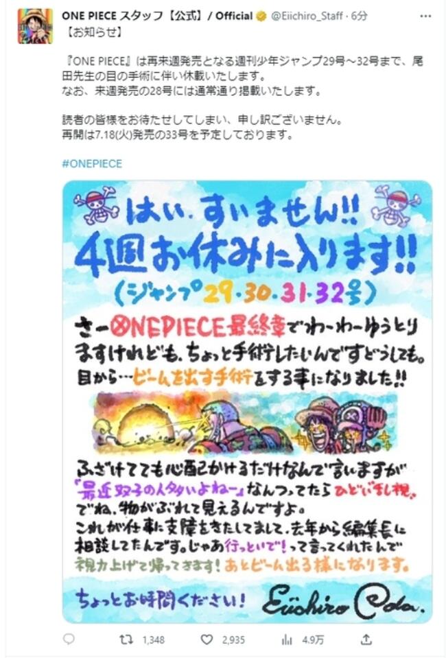 其官網(wǎng)還發(fā)布了尾田榮一郎在自己的手繪插畫上寫的“請(qǐng)假條”。他表示:“非常抱歉,我將休息四周時(shí)間?!逗胶M酢冯m然已經(jīng)進(jìn)入終章,但由于眼睛的散光很嚴(yán)重,看東西時(shí)出現(xiàn)重影,所以需要做個(gè)手術(shù)。請(qǐng)給我一些時(shí)間(修養(yǎng)一下)?!?/p>