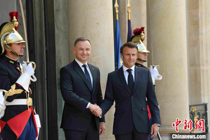 當?shù)貢r間6月12日晚,法國總統(tǒng)馬克龍在巴黎愛麗舍宮會見波蘭總統(tǒng)杜達。杜達前來出席當天舉行的法德波三國領(lǐng)導人會談。 中新社記者 李洋 攝
