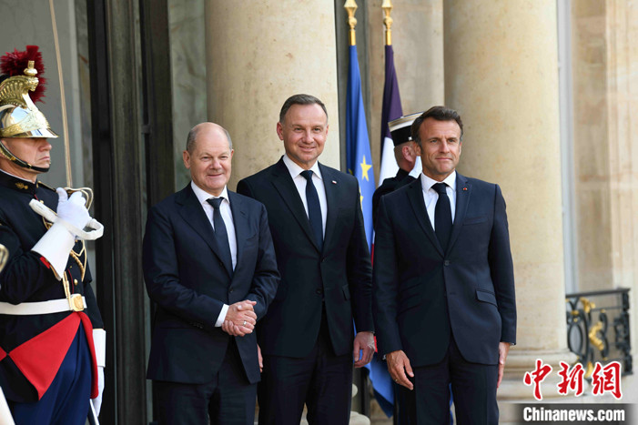 當?shù)貢r間6月12日晚,法國總統(tǒng)馬克龍在巴黎愛麗舍宮與德國總理朔爾茨、波蘭總統(tǒng)杜達會面。他們共同出席“魏瑪三角”機制下的三國領(lǐng)導人會議。 中新社記者 李洋 攝