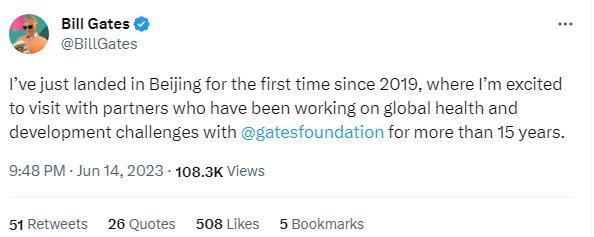 中新網(wǎng)6月14日電 北京時間14日,比爾及梅琳達·蓋茨基金會聯(lián)席主席兼理事、美國微軟公司聯(lián)合創(chuàng)始人比爾·蓋茨在社交媒體上發(fā)文稱已抵達北京。