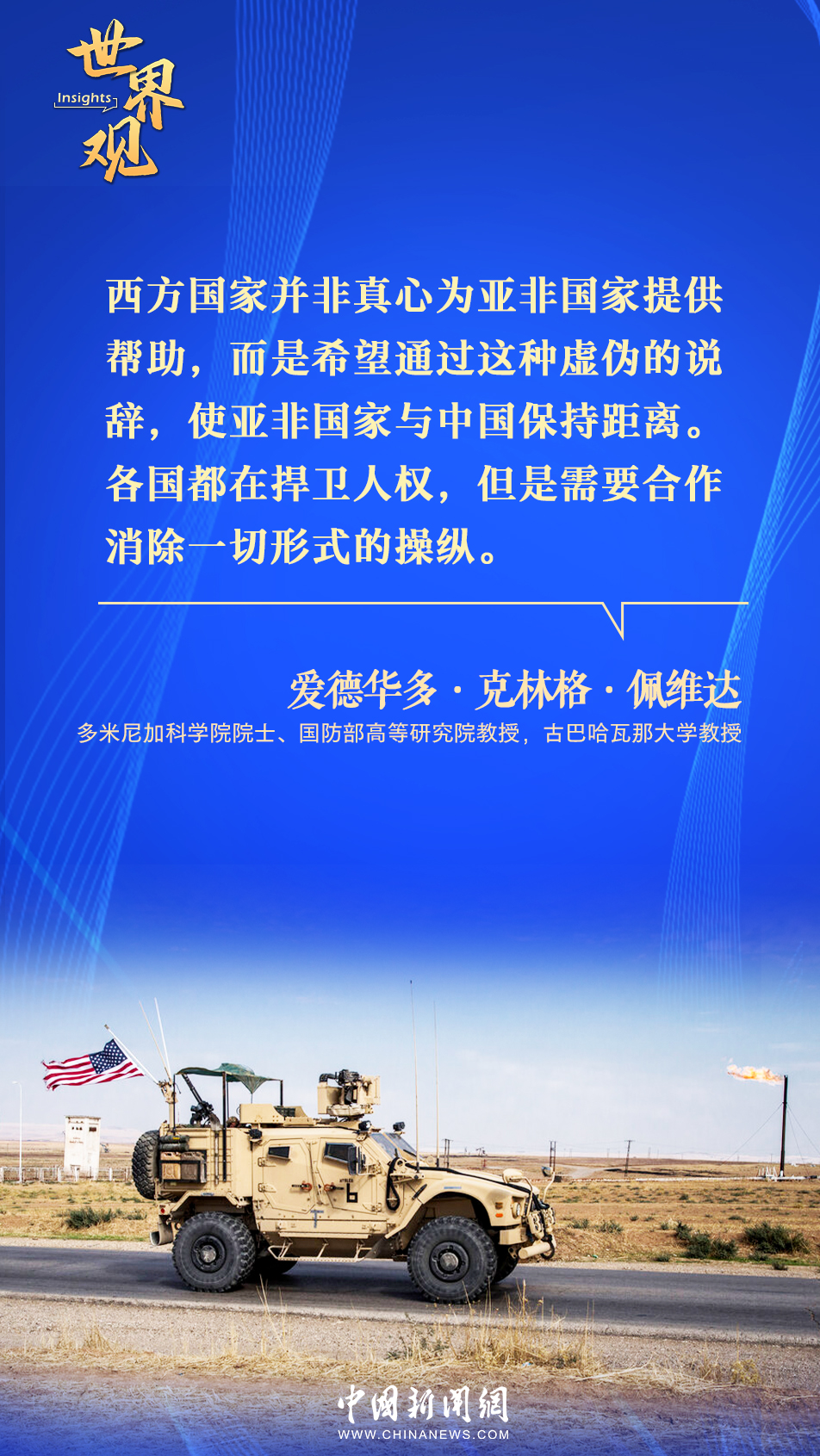 多米尼加科學院院士、國防部高等研究院教授、古巴哈瓦那大學教授愛德華多·克林格·佩維達表示,西方對亞非國家的幫助是虛偽的,其真實目的在于操縱亞非國家與中國保持距離。