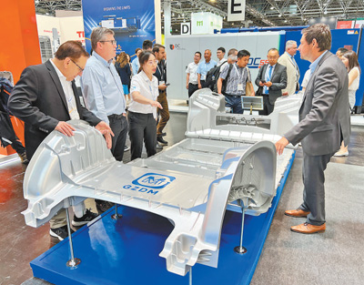 在中國壓鑄機制造商伊之密集團展位前,該集團與中國一家整車制造企業(yè)共同完成的“超大型一體化壓鑄件”一亮相就受到廣泛關注。伊之密壓鑄機事業(yè)部產(chǎn)品經(jīng)理張敦吉告訴記者,該產(chǎn)品為一體化壓鑄的汽車后地板,是全球最大的大型一體化壓鑄結構件之一。一體化壓鑄技術是制造新能源汽車的關鍵技術,采用該技術的鋁合金后地板總成的總重量最輕能達到鋼結構的1/3,生產(chǎn)時間也從兩個小時縮短至3分鐘,同時還大幅減少了車身零件數(shù)量和焊接點,有效減少了能源消耗和成本。