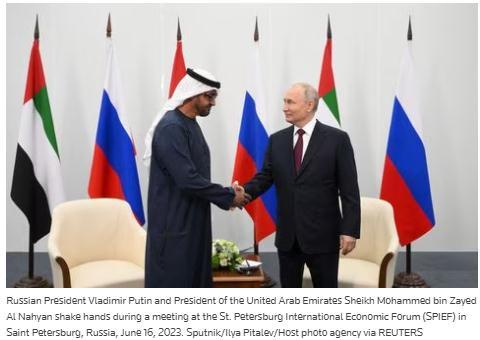 當地時間16日,阿聯酋總統穆罕默德·本·扎耶德·阿勒納哈揚與俄羅斯總統普京在圣彼得堡國際經濟論壇會晤。圖片來源:路透社報道截圖
