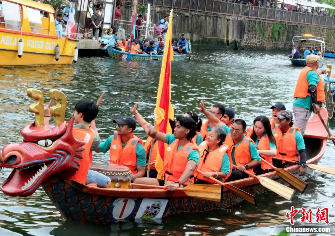 龍舟文化受到馬六甲和馬來西亞各族民眾歡迎。圖為2023年游龍舟活動6月18日開幕,很多參賽隊都由馬來裔或當?shù)胤侨A裔民眾組成。陳悅 攝