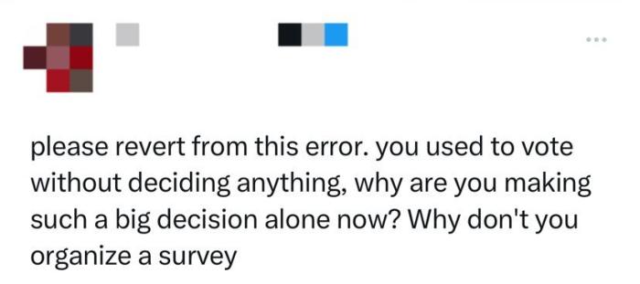有網友呼吁,“請改正這個錯誤。你以前在投票時都不做出任何決定,為什么現(xiàn)在要獨自做出這么大的決定?你為什么不組織一次調查。”