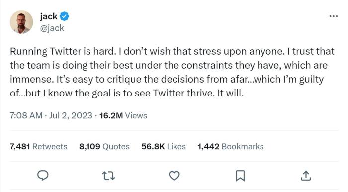 推特聯(lián)合創(chuàng)始人、前首席執(zhí)行官杰克·多爾西隨后發(fā)表了對此事的看法,他表示,“運營推特是很困難的。我不希望任何人受到這種壓力。我相信這個團隊在巨大的限制條件下,正在盡最大努力。從遠處批評這些決定是很容易的……我也對此感到歉疚……但我知道他們的目標是要看到推特的繁榮。它會的。”