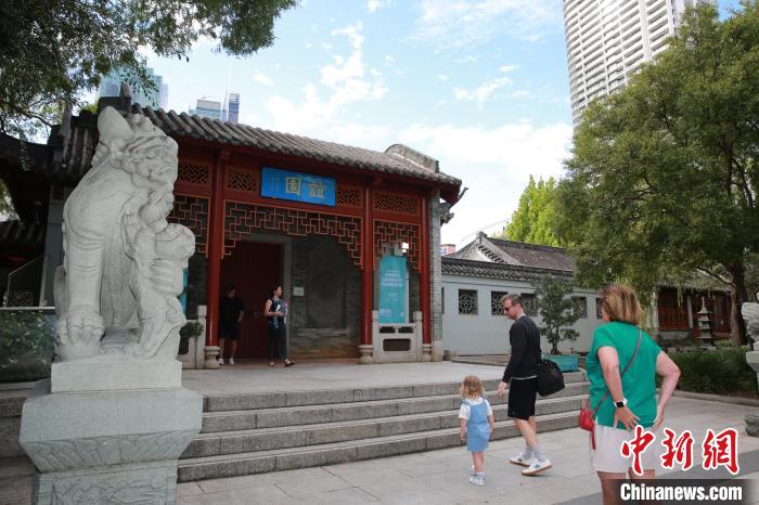 7月1日,游客在誼園“騰龍戲珠”琉璃壁前中餐廳休憩。 羅文俊 攝