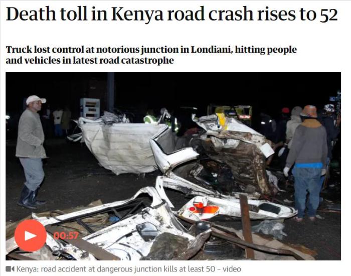 穆爾科門在一份聲明中表示,死亡人數(shù)為52人,另有32人受傷,并補充說,肇事卡車的注冊地是盧旺達。肯尼亞媒體報道稱,肇事車輛的司機已經(jīng)死亡,但法新社稱,這一消息無法立即得到證實。