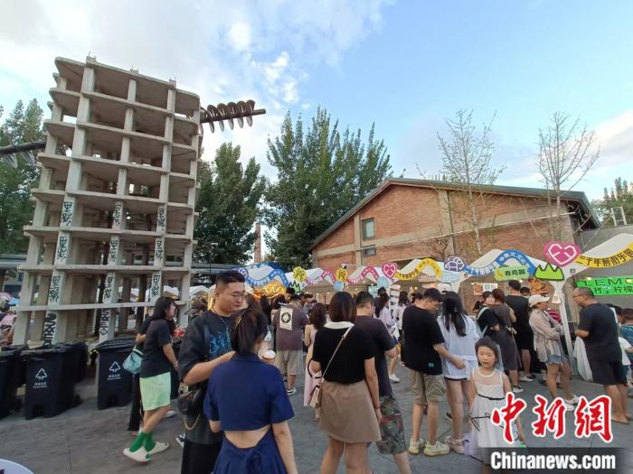 7月8日晚上8點(diǎn),盡管天色已經(jīng)暗下來(lái),但北京的地表溫度仍在30℃以上。在798藝術(shù)區(qū)南門(mén),一處方形場(chǎng)地被分割成幾排街道,200余家商鋪聚集在這里。在臨時(shí)搭建的白色攤位前,擠滿了游客。
