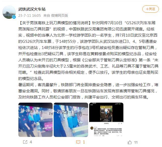 經(jīng)核實,視頻中的當事人為北京一學校游學團隊的一名學生,持7月10日武漢至北京西的G526次列車車票,于14時55分,該游學團隊從武漢站東進口3、4、5號通道安檢依次進站,14時58分該學生的行李包在3號機被安檢員查出疑似存在管制刀具,并開包檢查出3把疑似刀具,該學生稱是在黃鶴樓景點購買的模型紀念品,經(jīng)安檢人員確認為未開刃的刀具模型,根據(jù)《公安部關于管制刀具認定標準》第一條“未開刃且刀尖倒角半徑R大于2.5毫米的各類武術、工藝、禮品等刀具不屬于管制刀具范疇。”檢查此玩具模型符合相關規(guī)定,便予以放行。該學生的母親也證實是購買的模型紀念品。