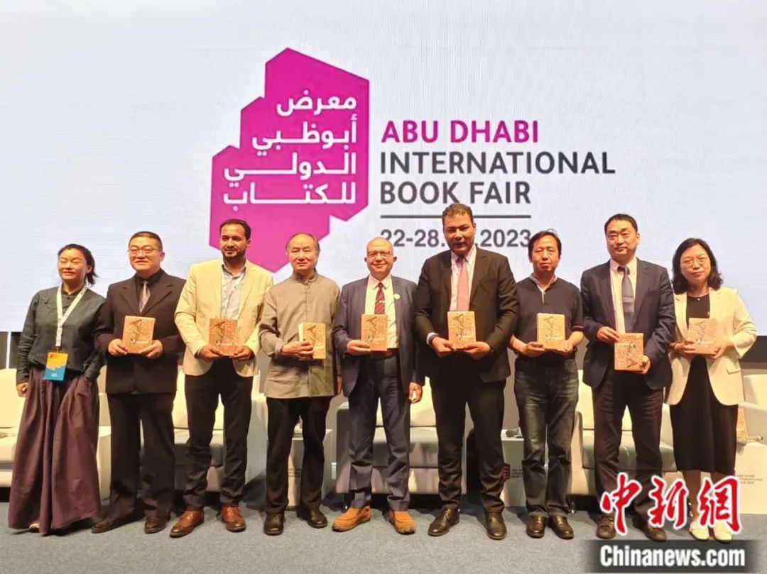 在阿布扎比國(guó)際書(shū)展上,譯林出版社與埃及??诉~特文化集團(tuán)聯(lián)合舉辦《捎話(huà)》阿拉伯文版新書(shū)首發(fā)儀式。譯林出版社 供圖