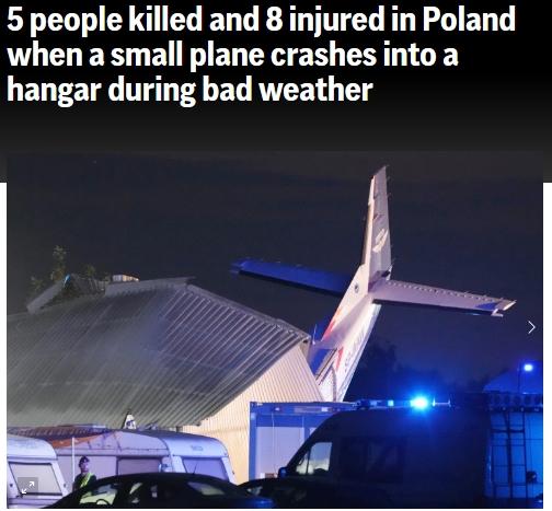 據(jù)報道,當天,波蘭國家消防局發(fā)言人莫妮卡·諾瓦科斯卡·布林達(Monika Nowakowska-Brynda)表示,“波蘭中部的克辛諾(Chrcynno)地區(qū),受惡劣天氣影響,一架塞斯納型飛機在降落時墜入跳傘中心的機庫,事發(fā)時有10人在機庫中,飛行員和在機庫中躲避暴風雨天氣的4名人員遇難?!?/p>
