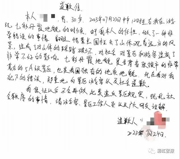 通報(bào)表示,該游客進(jìn)入?yún)^(qū)域是張掖世界地質(zhì)公園彩色丘陵保護(hù)范圍,雖然因其行走的山脊被黃土覆蓋,未造成實(shí)質(zhì)性損害,但其行為違反了《張掖七彩丹霞保護(hù)條例》和《治安管理處罰法》相關(guān)規(guī)定。7月24日16:50該游客從旅游途中返回臨澤縣,接受相關(guān)部門調(diào)查處理。市、縣林草部門對(duì)該游客進(jìn)行了嚴(yán)肅的批評(píng)教育;丹霞景區(qū)派出所依據(jù)《治安管理處罰法》對(duì)該游客處以200元罰款;該游客深刻認(rèn)識(shí)到自身行為的錯(cuò)誤性和嚴(yán)重性,并公開(kāi)致歉。