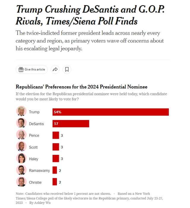 中新網(wǎng)7月31日電 據(jù)《紐約時(shí)報(bào)》報(bào)道,《紐約時(shí)報(bào)》和錫耶納學(xué)院31日公布了一項(xiàng)針對(duì)共和黨選民的聯(lián)合民意調(diào)查結(jié)果:在所有的共和黨總統(tǒng)競(jìng)選人中,特朗普以54%的支持率取得絕對(duì)領(lǐng)先地位,超出第二位德桑蒂斯37%,其余候選人支持率均未超過(guò)3%。