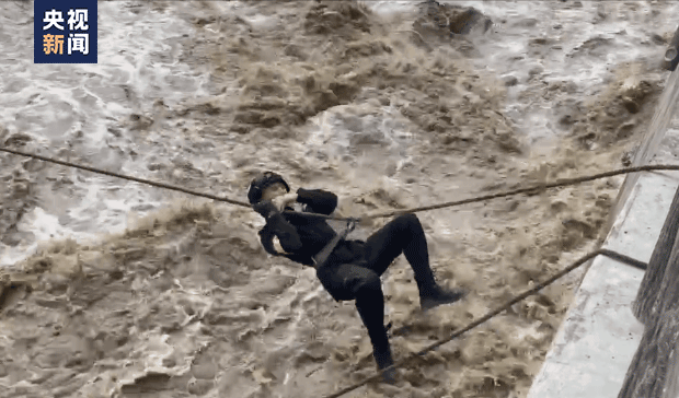 2022年9月5日,四川甘孜州瀘定縣發(fā)生6.8級(jí)地震,磨西鎮(zhèn)與青崗坪交匯處,湍急的流水?dāng)r住去路。甘孜特警隊(duì)員們用身體和繩索搭建橋梁,徒手爬繩索前往對(duì)岸救援。圖片來(lái)源:央視新聞視頻截圖
