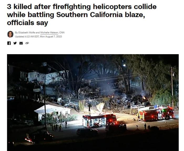中新網(wǎng)8月7日電 綜合美媒報道,美國消防官員表示,當?shù)貢r間8月6日,一架被派往加州撲滅野火的消防直升機與另一架消防直升機相撞,造成3人死亡。