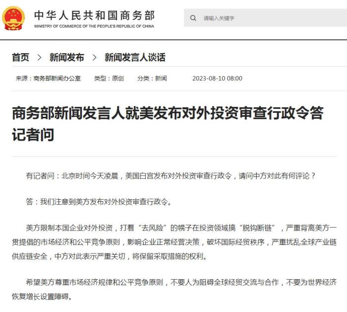 中國(guó)商務(wù)部新聞發(fā)言人8月10回應(yīng)稱,美方限制本國(guó)企業(yè)對(duì)外投資,打著“去風(fēng)險(xiǎn)”的幌子在投資領(lǐng)域搞“脫鉤斷鏈”,嚴(yán)重背離美方一貫提倡的市場(chǎng)經(jīng)濟(jì)和公平競(jìng)爭(zhēng)原則,影響企業(yè)正常經(jīng)營(yíng)決策,破壞國(guó)際經(jīng)貿(mào)秩序,嚴(yán)重?cái)_亂全球產(chǎn)業(yè)鏈供應(yīng)鏈安全,中方對(duì)此表示嚴(yán)重關(guān)切,將保留采取措施的權(quán)利。