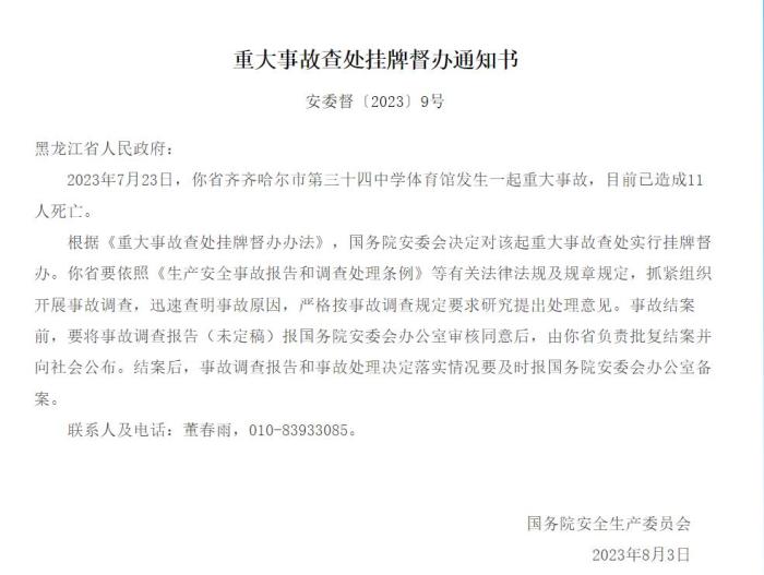 中新網8月14日電 據應急管理部網站14日消息,國務院安委會發(fā)布重大事故查處掛牌督辦通知書。2023年7月23日,黑龍江省齊齊哈爾市第三十四中學體育館發(fā)生一起重大事故,目前已造成11人死亡。根據《重大事故查處掛牌督辦辦法》,國務院安委會決定對該起重大事故查處實行掛牌督辦。