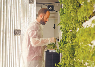 以色列一家農(nóng)業(yè)科技公司在超市、餐館和購物中心的室內(nèi)外安裝了多處便攜式城市垂直農(nóng)場裝置。在這樣的“農(nóng)場”中,蔬菜垂直排列在墻壁上的容器里,減少對水和土壤的使用,提高種植效率,供顧客選購。圖為一名工作人員在一家超市旁的垂直農(nóng)場查看蔬菜生長情況。