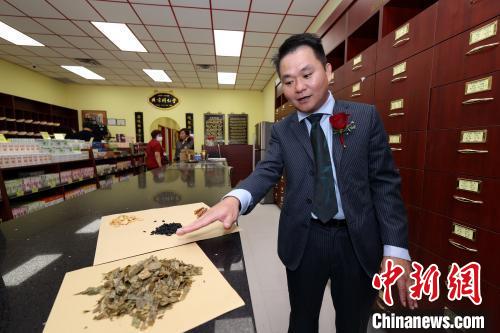 當(dāng)?shù)貢r(shí)間9月1日,加拿大多倫多,北京同仁堂位于大多倫多地區(qū)的第四家分店在安大略省列治文山(Richmond Hill)市開業(yè)。圖為北京同仁堂(多倫多)有限公司副總經(jīng)理肖常國(guó)向記者介紹店內(nèi)中藥材?!≈行律缬浾?余瑞冬 攝