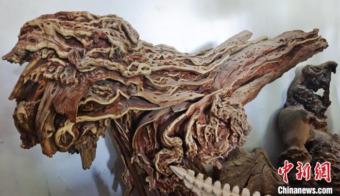 中新網(wǎng)新疆阿拉爾9月2日電(史玉江)一根腐朽的樹根,或許在別人眼里一文不值,可是在戴新看來,朽木可雕琢,那些腐朽的樹根不僅能做成工藝品,還能增收致富?!霸诎⒗瓲栠@片土地上,各種樹根和朽木段,不管是沙漠中的,還是河道里的,只要我看上,都盡可能搬回來?!毙陆a建設兵團第一師阿拉爾市“非遺”根雕傳承人戴新說,通過自己的雙手制作的根雕作品,讓他的生活樂趣無限。