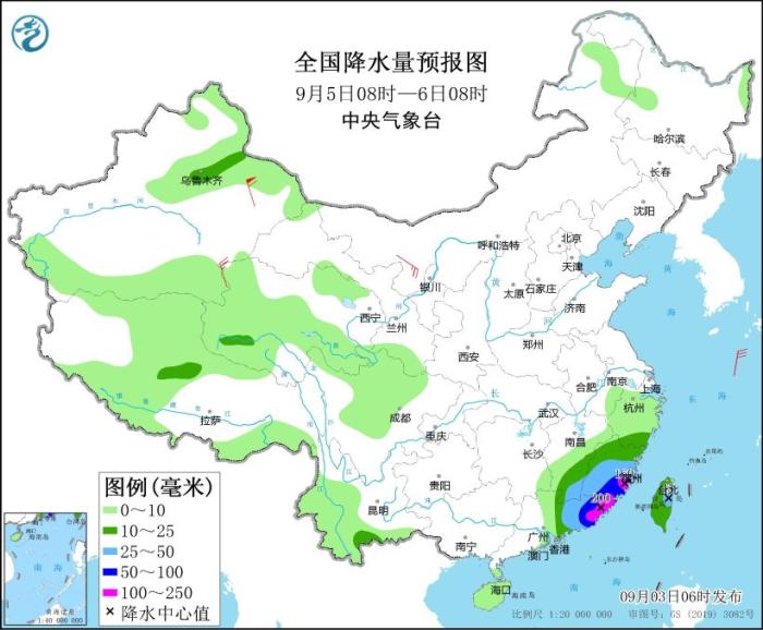 9月5日08時至6日08時,新疆沿天山地區(qū)、浙江南部、福建大部、江西東南部、廣東中東部、臺灣島等地部分地區(qū)有中到大雨,其中,福建東南部、廣東東部等地部分地區(qū)有暴雨或大暴雨(100~200毫米)。內蒙古西北部、青海西部等地部分地區(qū)有4~6級風,其中,新疆東部部分地區(qū)有8~9級風。東海南部、臺灣以東洋面、臺灣海峽、巴士海峽、南海東北部有6~8級大風、陣風10~11級,其中臺灣以東洋面、臺灣海峽、巴士海峽北部、南海東北部部分海域風力可達9~11級、陣風13~14級。