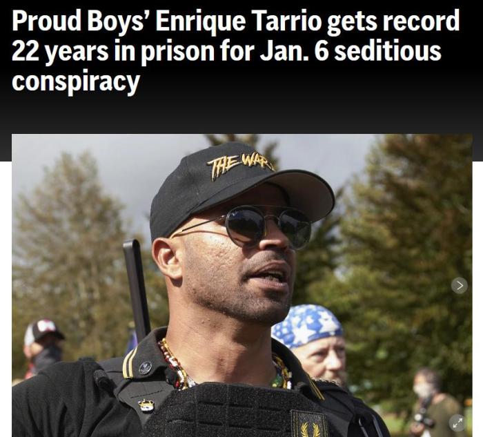 據(jù)報(bào)道,涉嫌幕后策劃2021年1月6日美國(guó)國(guó)會(huì)騷亂的極右翼組織“驕傲男孩”前主席塔里奧(Enrique Tarrio),于當(dāng)?shù)貢r(shí)間5日在華盛頓特區(qū)聯(lián)邦法院被判處22年監(jiān)禁刑期,被控煽動(dòng)陰謀等罪名。