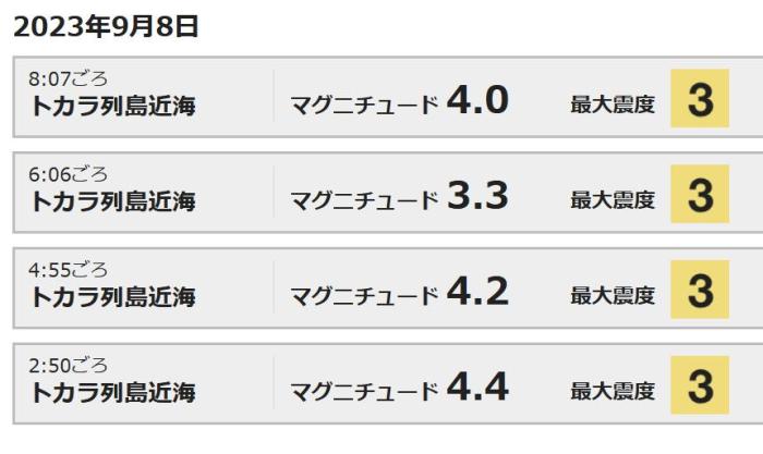 據報道,4次地震的震級分別為4.4級、4.2級、3.3級和4.0級,震中都位于鹿兒島縣吐噶喇列島附近,附近的土島村有明顯震感。