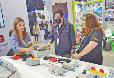 在一家泰國(guó)電氣設(shè)備商的展位前,工作人員向參觀者介紹多種電控組件。