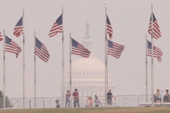 6月29日,在美國首都華盛頓,游客在華盛頓紀念碑游覽,遠處的國會大廈籠罩在煙霧中。新華社發(fā)(亞倫攝)