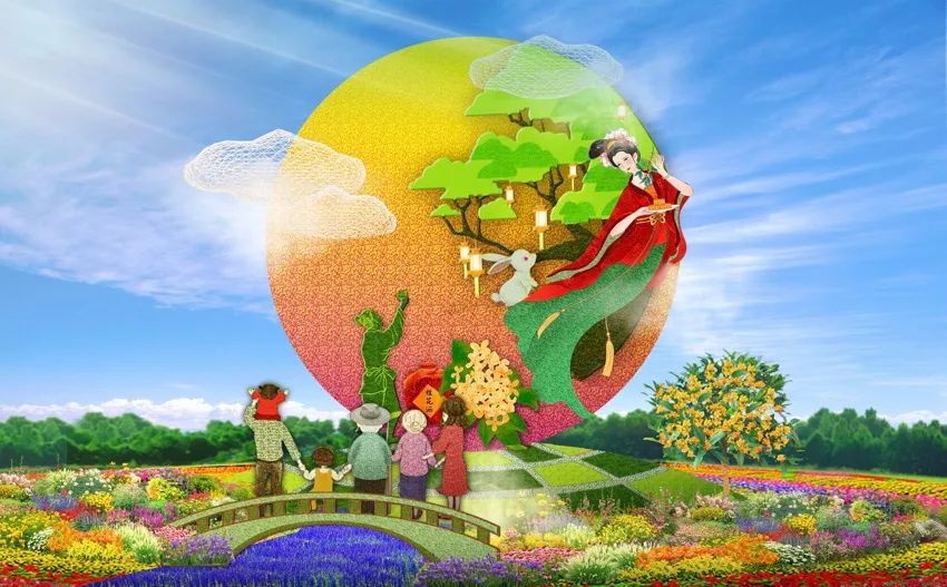 8. 西單西北角的“花好月圓”花壇頂高8米,以一家人中秋團(tuán)聚的溫馨畫面為場(chǎng)景,體現(xiàn)了花好月圓下的群眾幸福生活。
