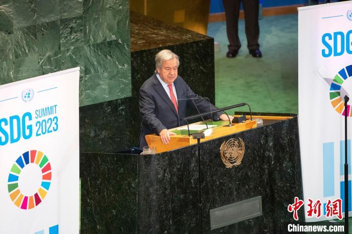 當(dāng)?shù)貢r(shí)間9月18日,聯(lián)合國可持續(xù)發(fā)展目標(biāo)峰會在紐約聯(lián)合國總部拉開帷幕。當(dāng)天,聯(lián)大通過一項(xiàng)政治宣言,會員國承諾加速實(shí)現(xiàn)2030年可持續(xù)發(fā)展目標(biāo)。圖為聯(lián)合國秘書長古特雷斯發(fā)表講話?!≈行律缬浾?王帆 攝