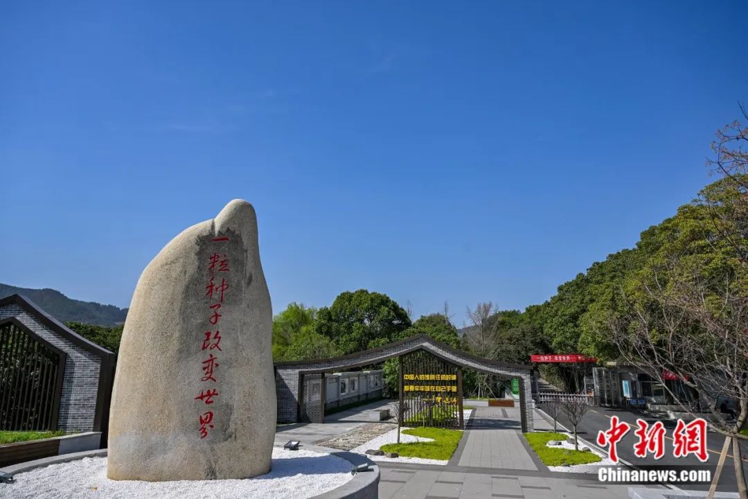 一顆標有“一粒種子 改變世界”紅色大字的稻米石頭高高聳立在安江農(nóng)校紀念園門口。潘雨 攝